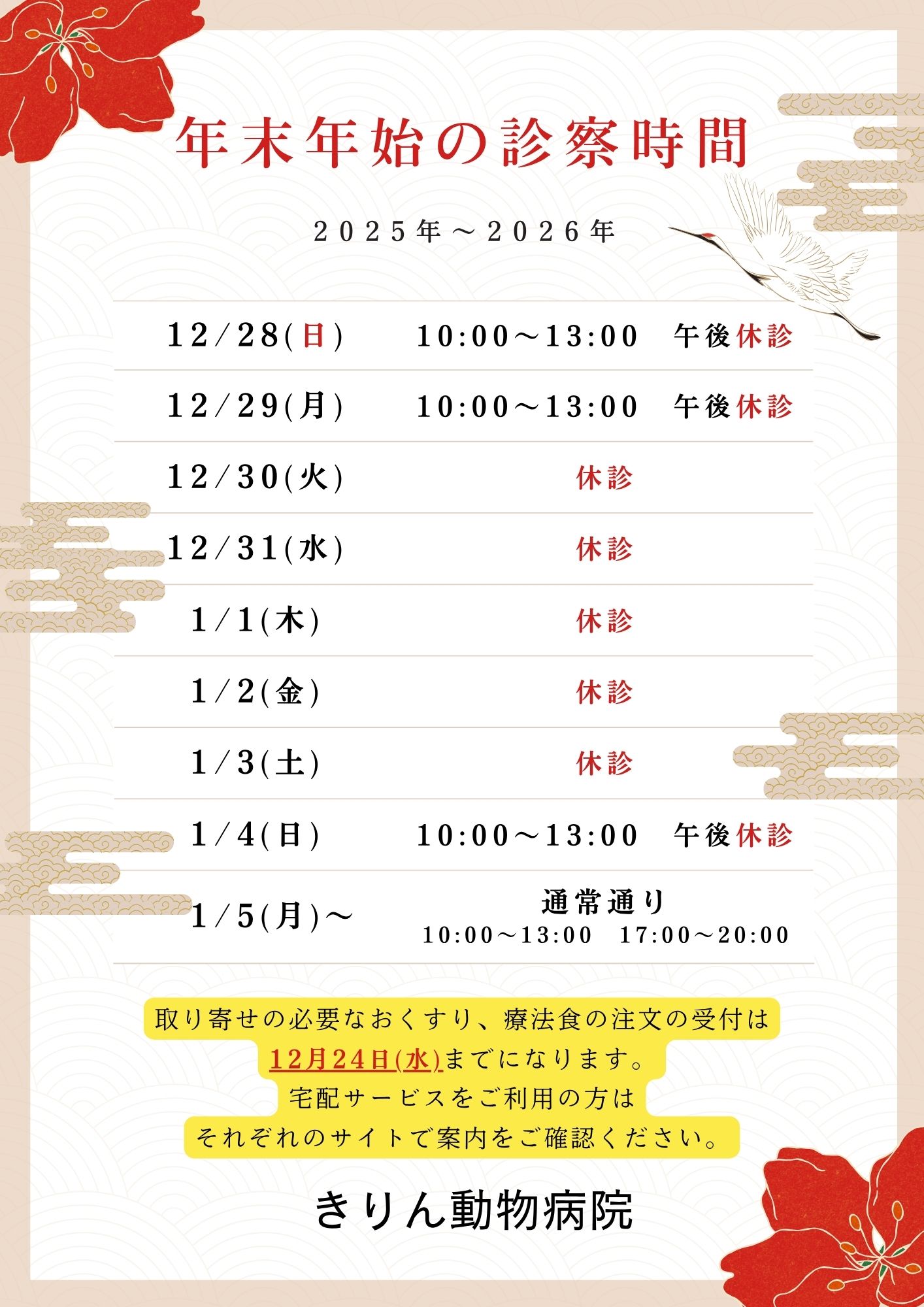 年末のおくすり・療法食の注文の受付は12月24日(水)19:30までになります。